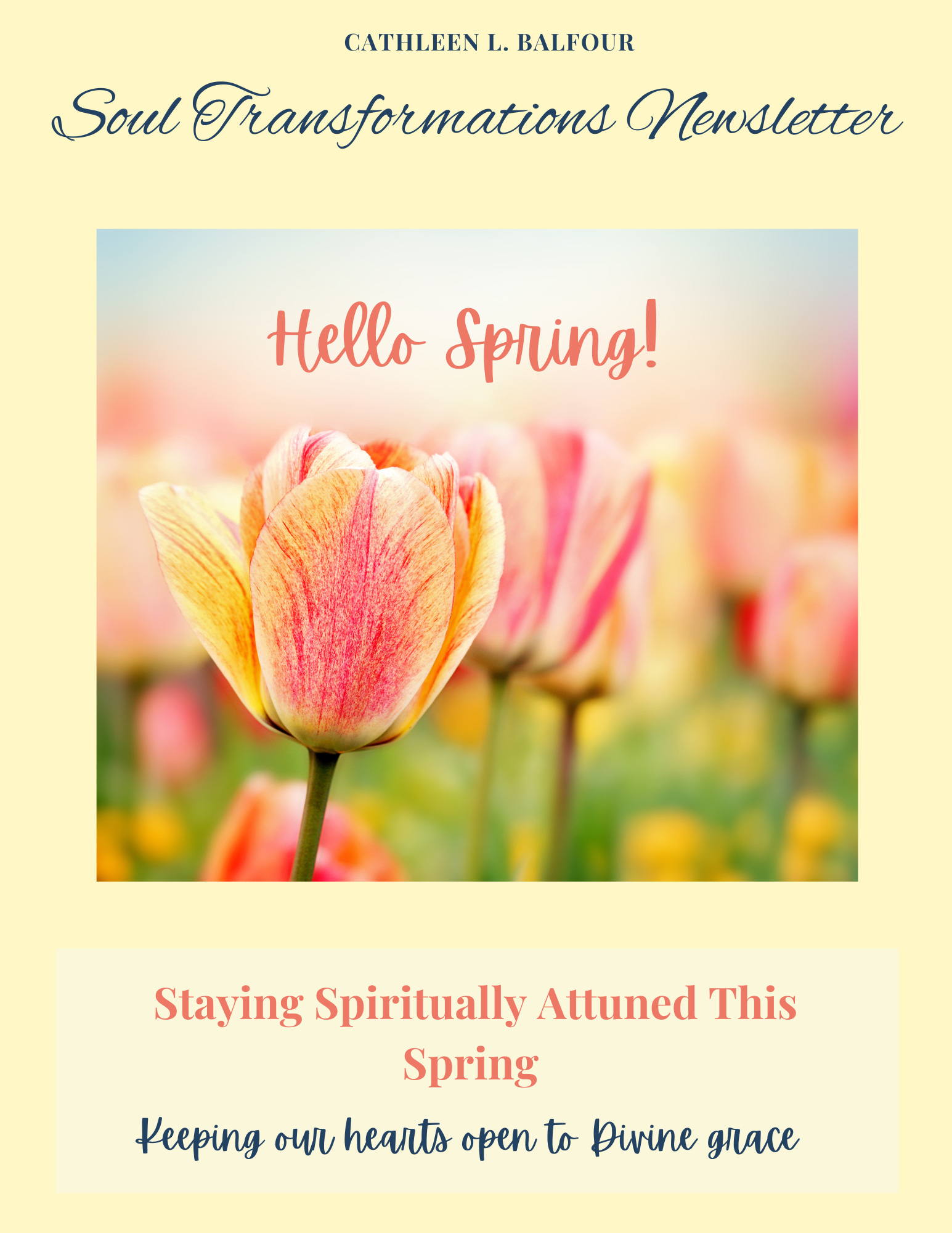 Soul Transformations NewsletterSoul Transformations April NewsletterStaying spiritually attuned this springCathleen L. BalfourApr 01, 2026∙ PaidShareHow do we navigate the profound highs and lows of our human journey, while staying spiritually attuned? Continue reading this post for free, courtesy of Cathleen L. Balfour.Claim my free postOr purchase a paid subscription.Previous